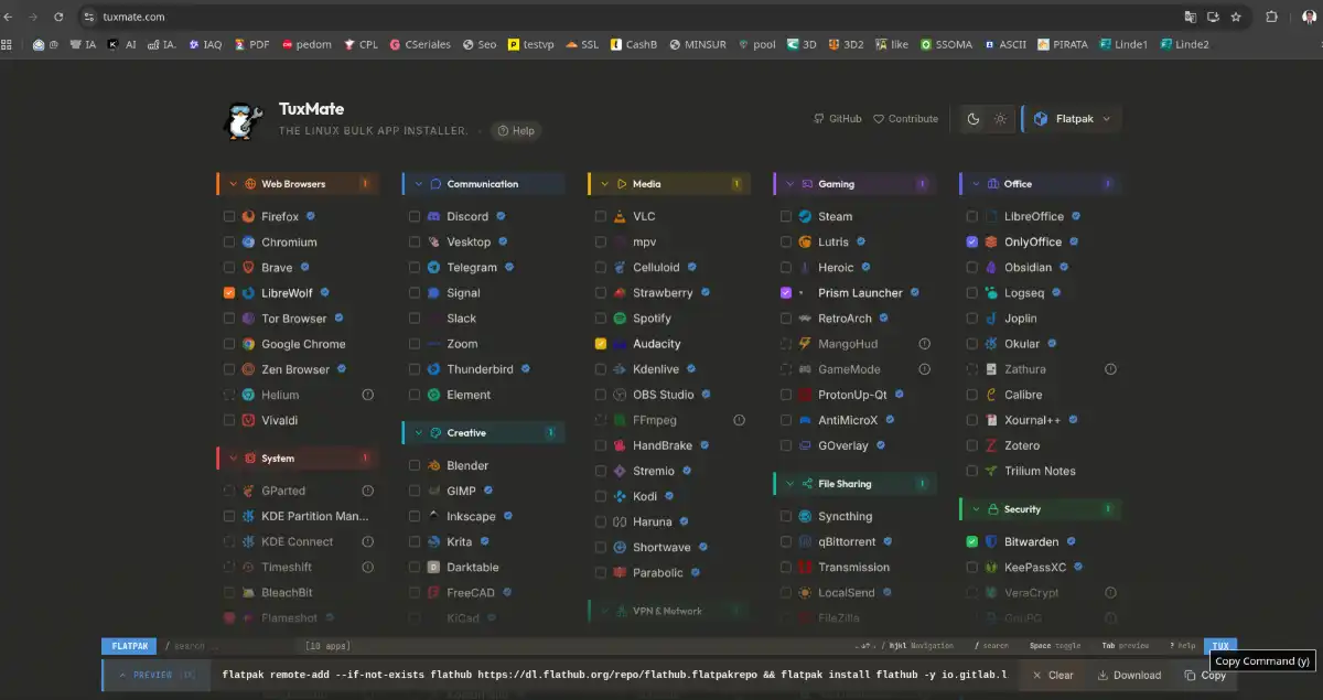 Su magia no está en la lista, sino en lo que hace después: tú marcas tus apps, y TuxMate genera un script de instalación único y optimizado para tu distribución específica (Ubuntu, Fedora, Arch, etc.). Copias un solo comando. Lo pegas en tu terminal. Y listo. Automatización pura.
